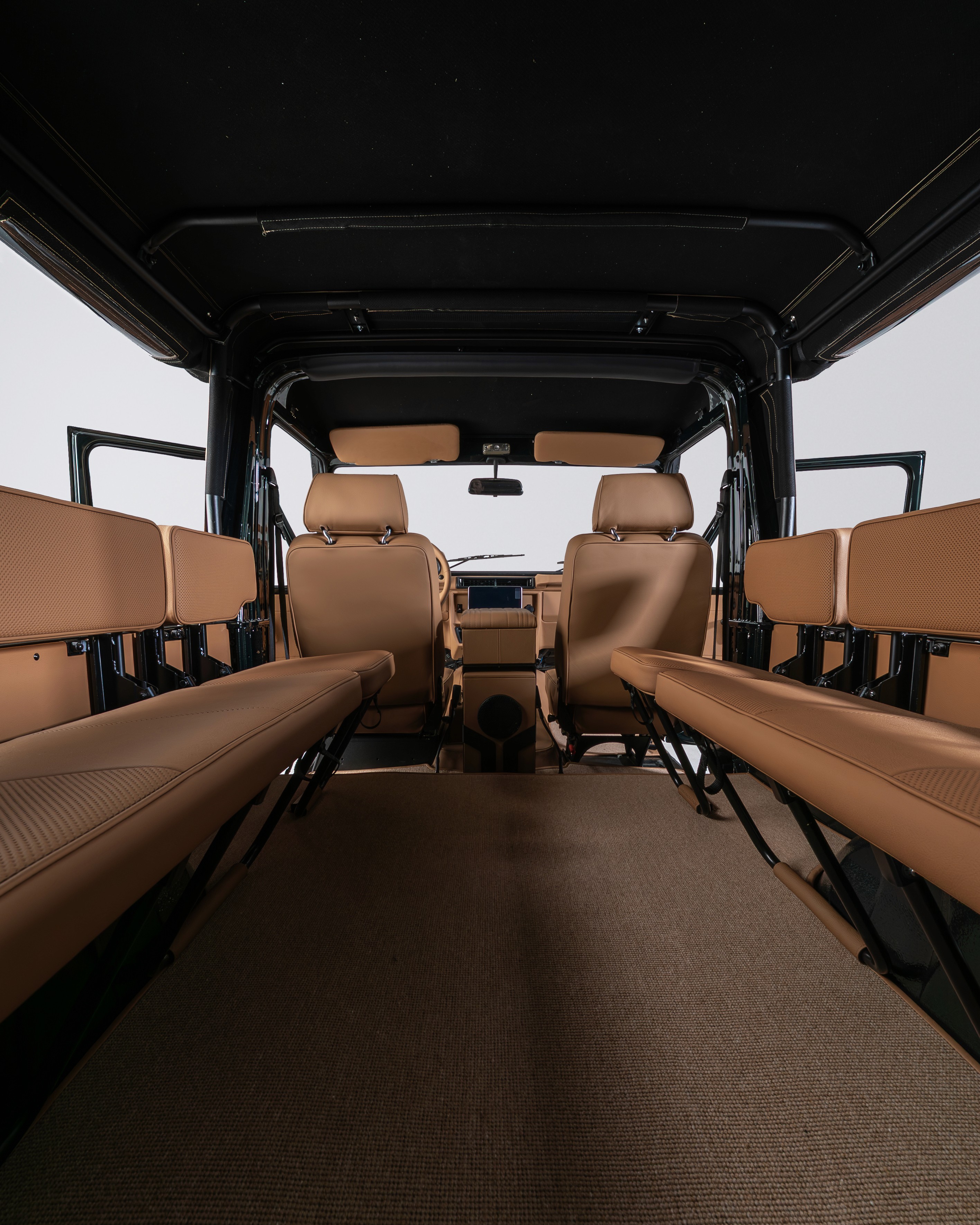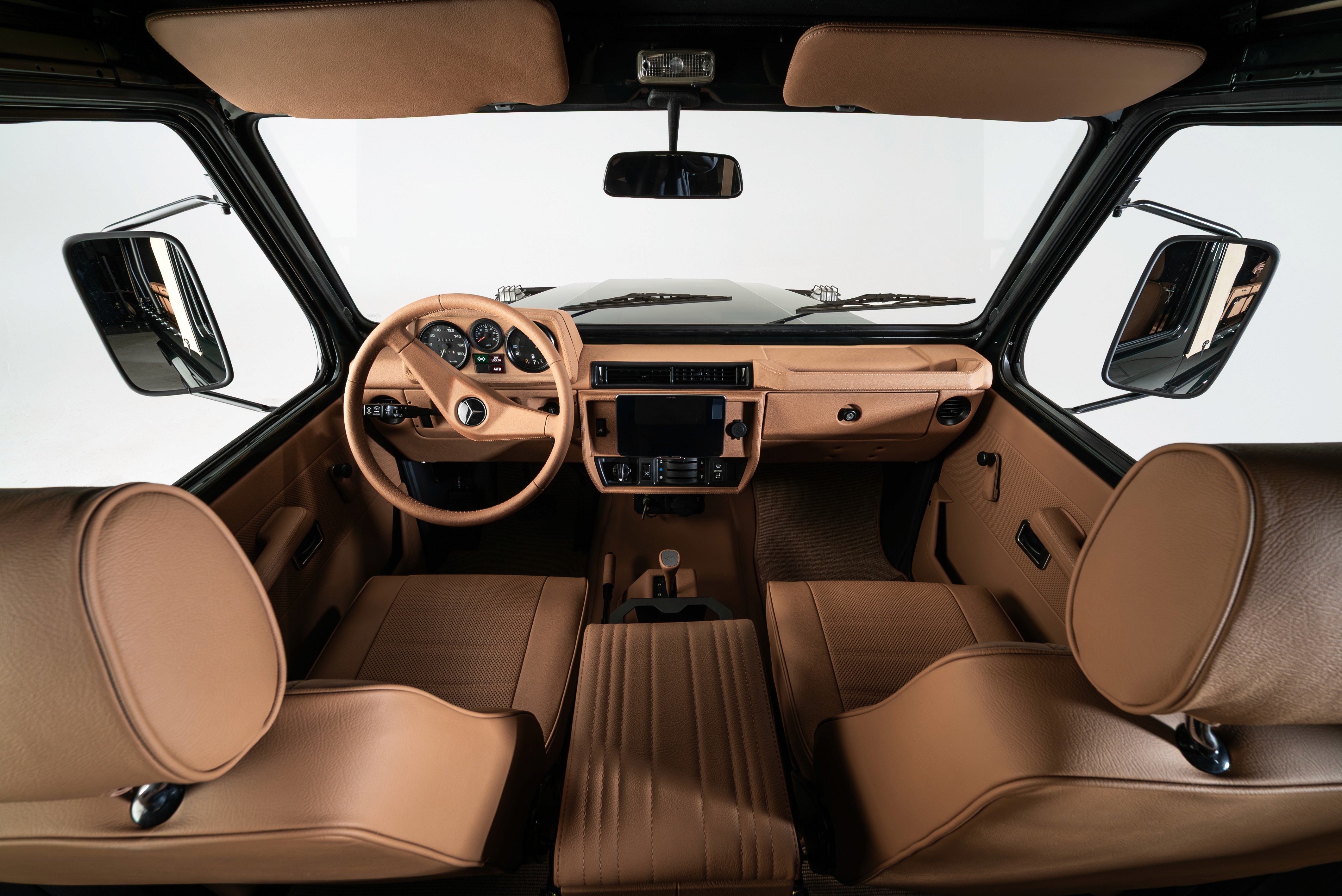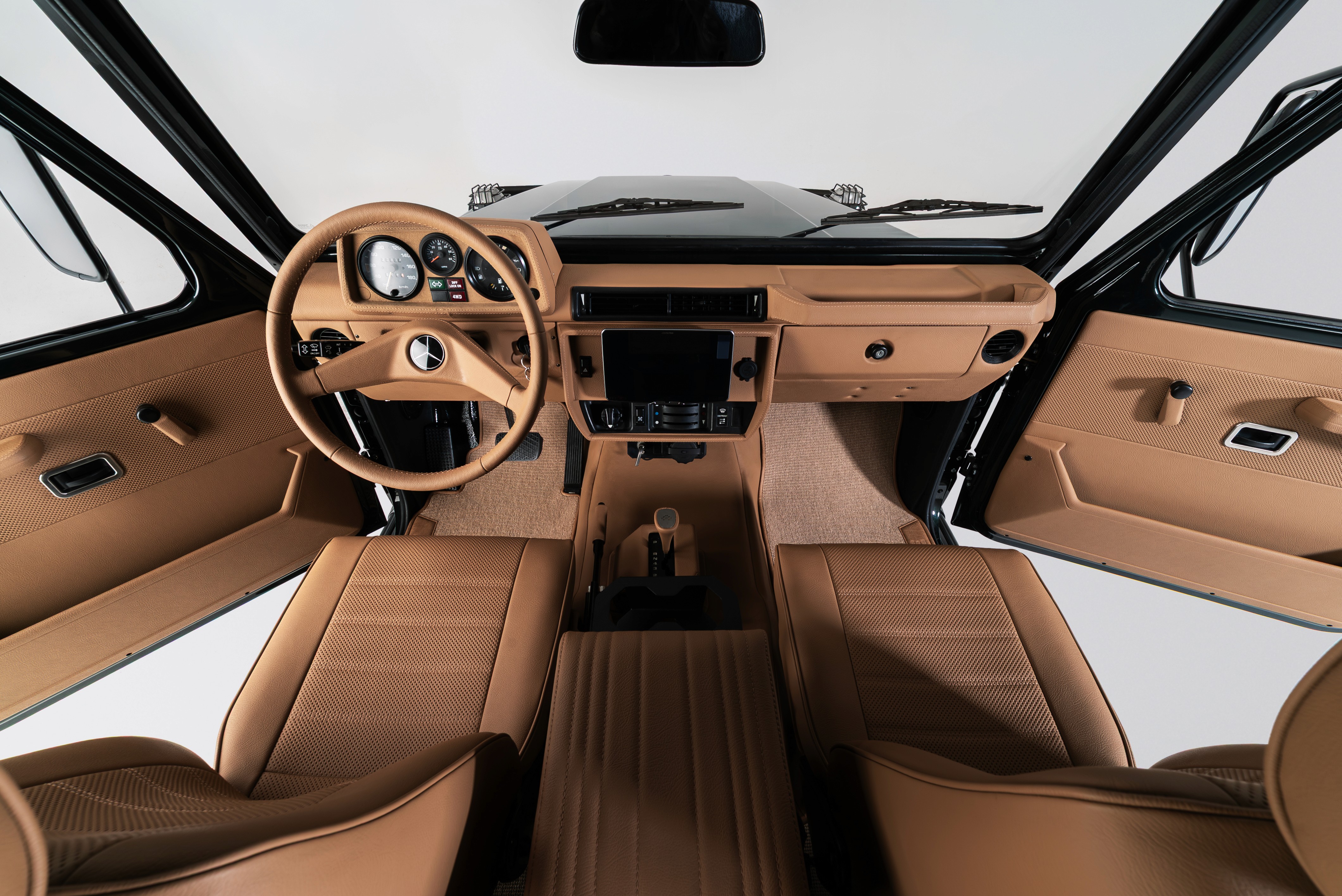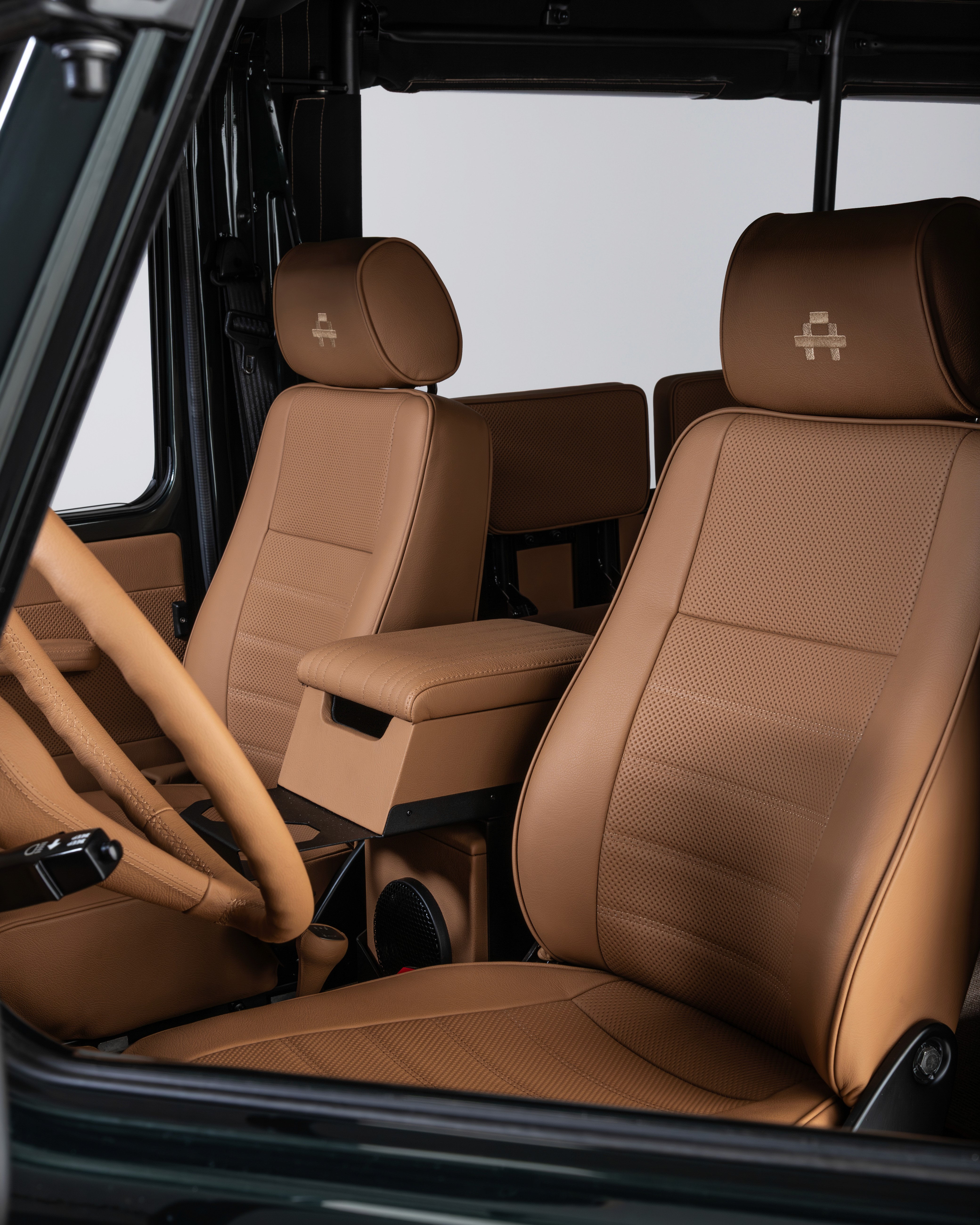Finished in a rich Cumbrian Green Metallic, this Mercedes-Benz GE 230 presents an understated and elegant interpretation of the classic G-Class. The depth of the metallic finish gives the truck a quiet presence, best appreciated in changing light and natural surroundings. Paired with a warm Palomino interior, the cabin feels both inviting and authentic. Retaining the original 2+6 seating configuration with rear bench seating, the layout stays true to the utilitarian roots of the GE230 while offering a unique and social driving experience. At its core, the original 2.3L inline-four engine has been fully restored, delivering a driving feel that remains faithful to the vehicle’s heritage. Trail Master suspension enhances comfort and capability, making it equally suited to long-distance touring or the steep European Alps. An 11” Alpine AV system with reverse camera has been installed, adding modern functionality without detracting from the classic character.