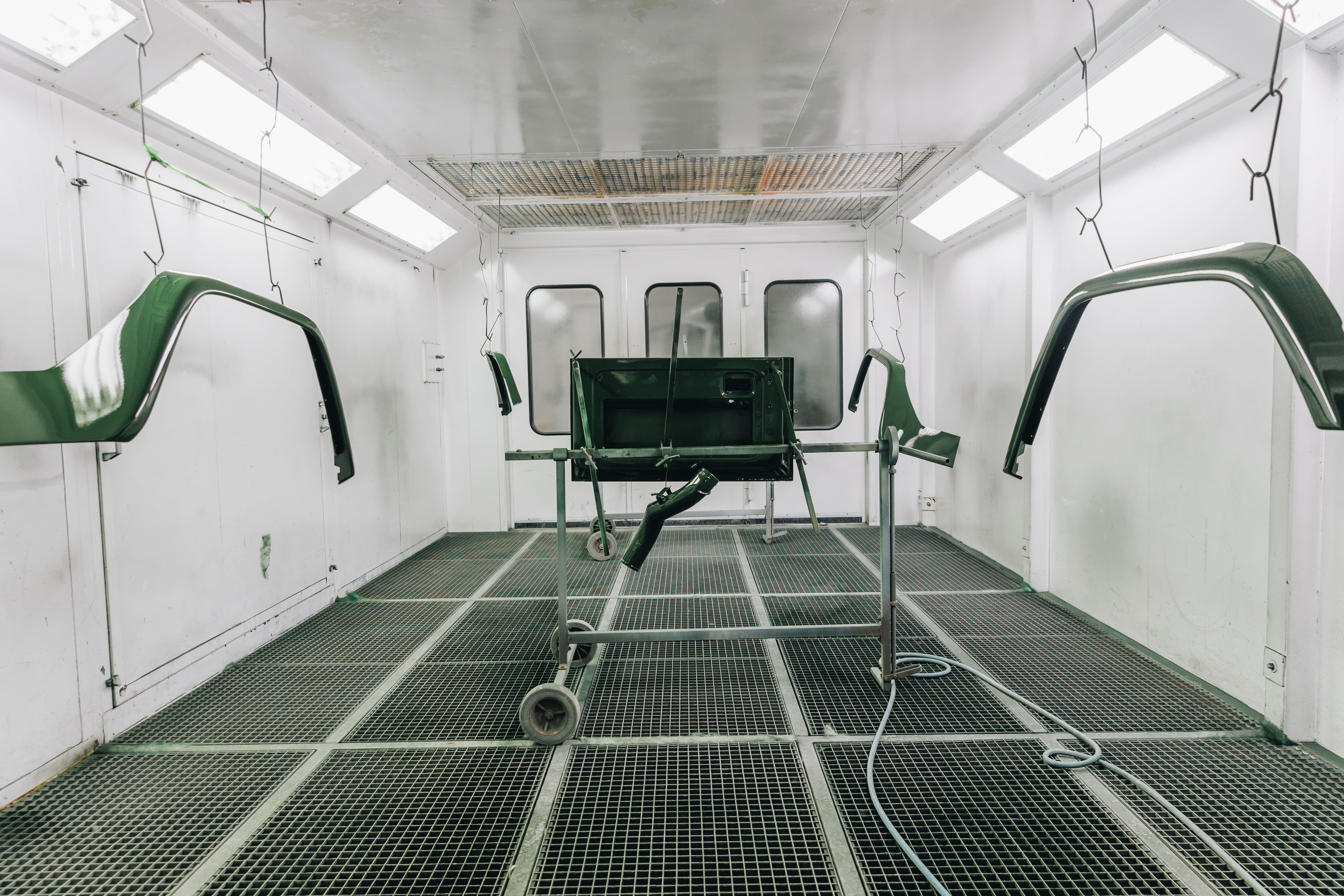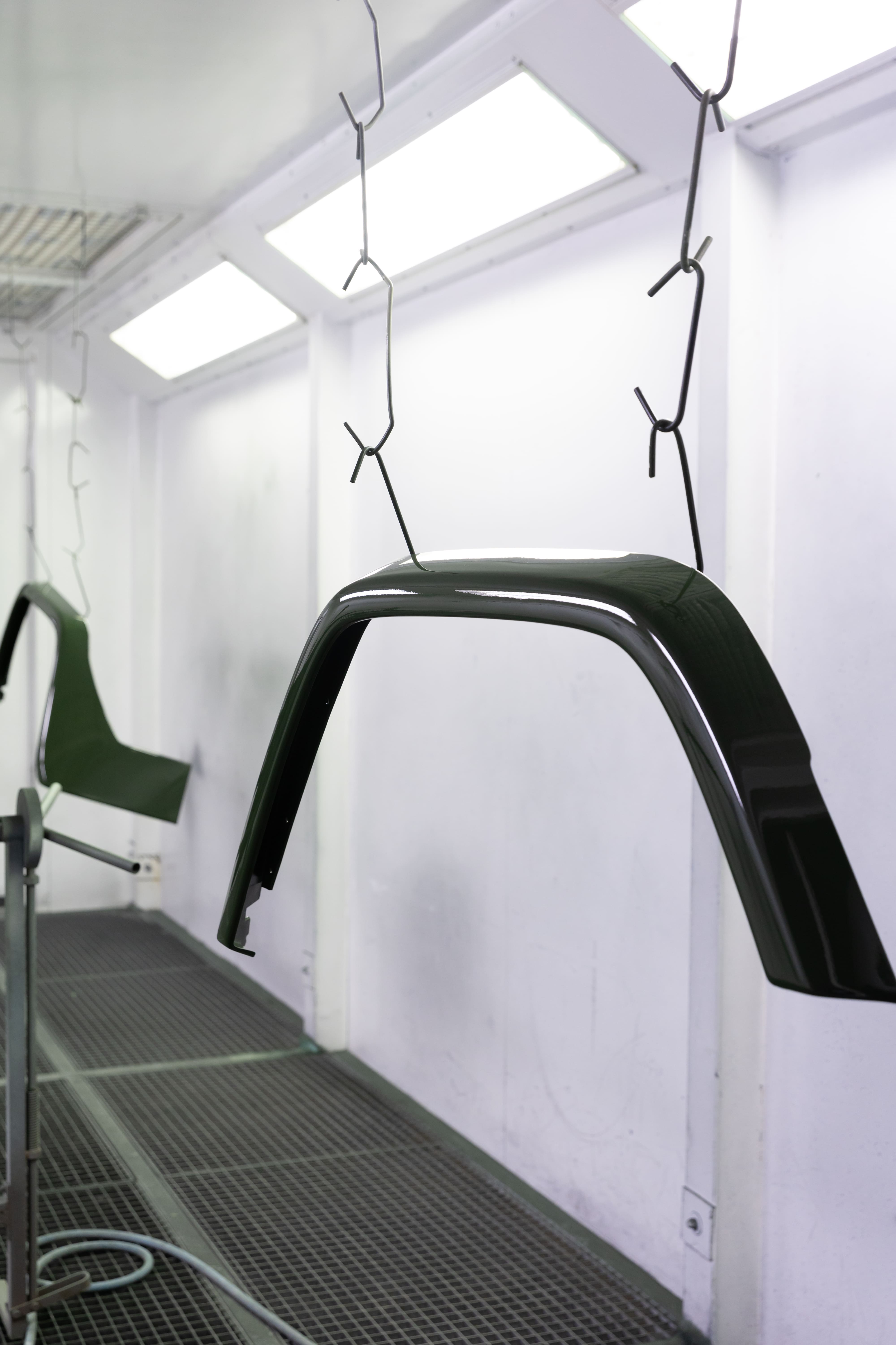 The chassis undergoes hundreds of hours of extensive repairs, addressing rust, dents, and any battle-hardened imperfections the car experienced in its years of service. After undergoing restoration and preparation, the vehicle's body is transferred to our climate-controlled facility. In this environment, our paint specialist meticulously administers anti-corrosive treatments, primer, and modern, high-quality automotive paint.